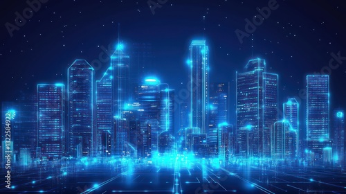 Show a sleek, high-tech city in shades of blue, with glowing neon lights and modern buildings, giving it a futuristic vibe