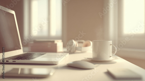 showcase, stylish, laptop, sleek, device, along, various, accessory, setup, include, modern, minimalist, desk, surrounded, essential, office, item, like, wireless, mouse, notebook, cup, hot drink, background, softly, blurred, emphasize, creating, professional, inviting, atmosphere, phone, next, pair, earphones, resting, nearby, highlight, productivity, creativity