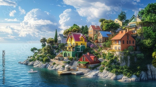 showcasing colorful houses on a steep hillside overlooking the shimmering ocean, with lush greenery surrounding the homes