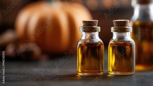 Showcasing two oil bottles with pumpkins in the background, creating a classic fall aesthetic. The image conveys warmth, comfort, and a festive autumn mood.