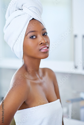 Shower, towel and portrait of black woman in bathroom for beauty, cosmetics and diy spa treatment. Self care, dermatology and morning glow with person at home for relax, pamper and skincare facial