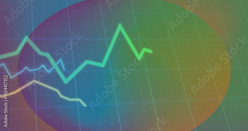 Showing green jagged line chart on digital grid, with multiple colored lines and gradient circles