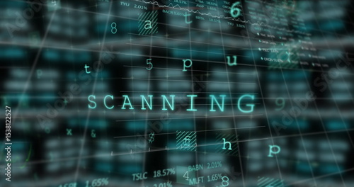 Showing teal SCANNING text hovering over digital grid interface, with code symbols and data charts
