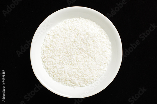 Shredded coconut in the white bowl isolated