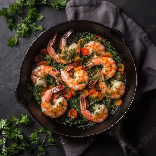 shrimp catalan fried in oil on a cast iron skillet, top view . generative AI