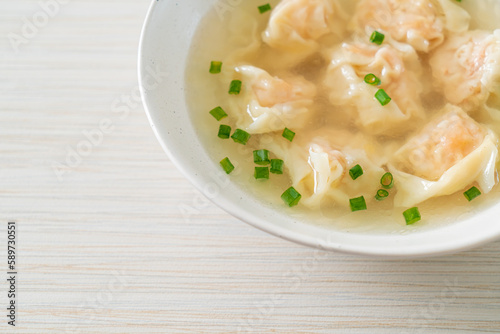 shrimp dumpling soup in white bowl