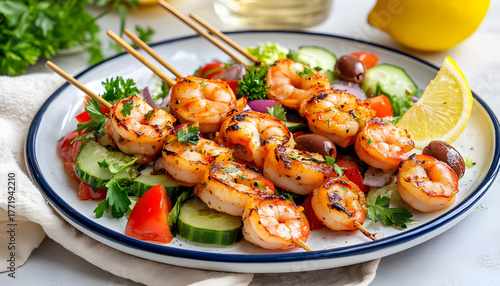 Shrimp kebab roasted on skewers and fresh vegetable salad