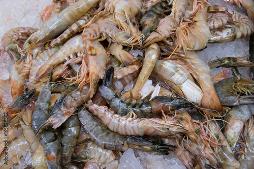 Shrimp on ice tray ready to sale in seafood market. Shrimp in chilled ice cream tray