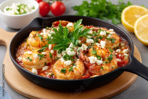 shrimp, feta, cheese, parsley, greece, greek, food, dish, cooking, pan, black, kitchen, mediterranean, diet, healthy, lunch, dinner, meal, eatery, cookery, tomatoes, sauce, lemon, tomatoes, seafood, seafood, prawn, ingredient, delicious, fresh, traditional, homemade