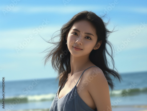 shy, beach, summer, wave, long hair, natural light, dress, clear sky, sea, scenery, calmness, smiling, ocean, outdoors, person, water, vacation, travel, 1, sun, woman, smile, happiness, joy