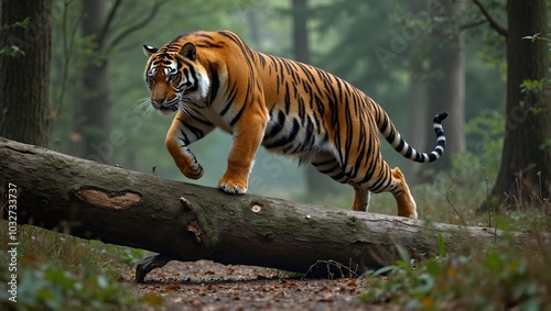 siberian tiger, leaping, fallen tree, dense forest, graceful, wildlife, predator, ferocious, big cat, powerful, majestic, stealthy, predatory, endangered species, striking, jungle, carnivore, roaring, dangerous, camouflage, sneaky