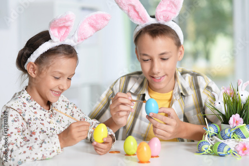 Siblings painting Easter eggs