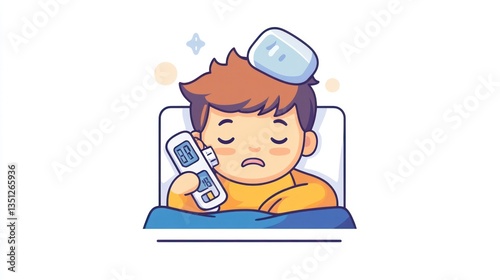 sick, boy, bed, ice, pack, thermometer, disease, resting, fever, health care, children, unwell, health, temperature, medicine, treatment, hospital, doctor, care, symptom, disease, virus, infection, flu, cold, pain, suffering, sleepy, weak, sleep, rest, comfort, home, room, recovery, patient, young, male, person, human, illustration, graphic, design, cartoon