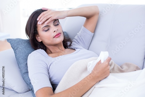 young adult, woman, female, caucasian, home, house, household, homelike, apartment, domicile, abode, lifestyle, leisure, domestic life, living room, lounge, couch, sofa, brunette, brown hair, pretty, beautiful, charming, gorgeous, lying, blanket, sick, ill, disease, virus, infection, cold, tissue, flu, hay fever, allergy, marode, disease, fever, flu, health, disease, suffer, symptom, temperature, indoor