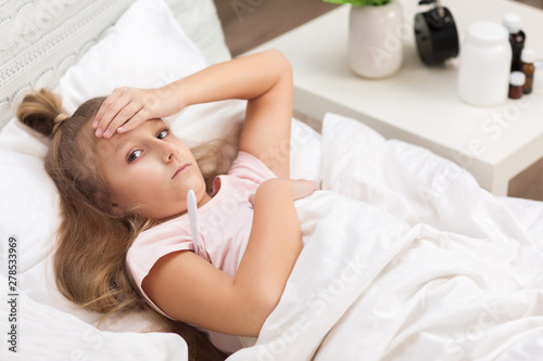 Sick little child girl lying in bed with thermometer. Cold flu season