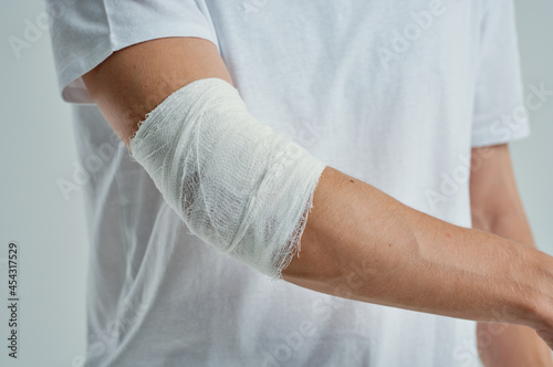 sick man in a white T-shirt with a bandaged hand light background