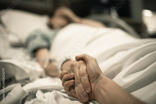 Sick woman in hospital bed with someone holding their hand giving them comfort.