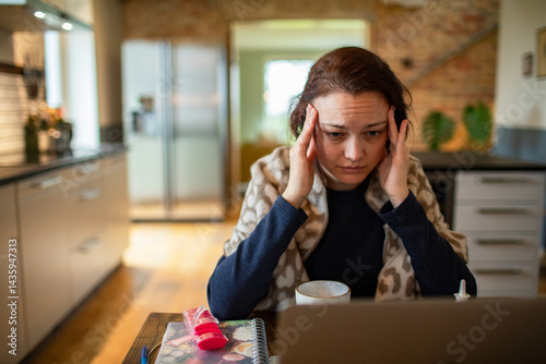 Sick woman wrapped in blanket working on laptop and feeling stressed at home