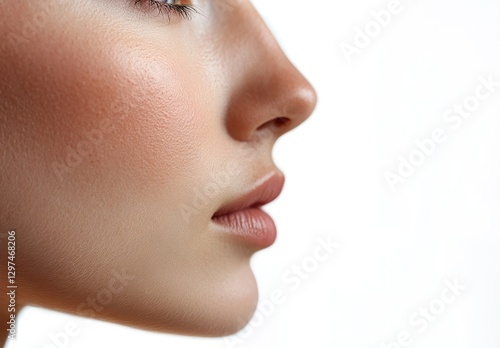 side face with closed mouth and straight nose on a white background. The woman's head is turned slightly to the right so that her left cheek can be seen