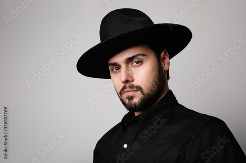 Side portrait of bearded hipster wearing black fedora hat and shirt looking at camera.
