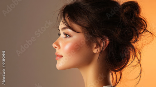 woman, side, profile, warm, lighting, elegance, serene, beauty, portrait, coiffure, calm, soft, feature, visual, art, natural, light, aesthetic, head shot, facial, skin, tone, feminine, thoughtful, styling, fashion, shoot, attractiveness, peaceful, artistry, expression, glow, shot, effect, studio, inspiration, gaze, glowing, ambience, warmth, tranquil, model, photographic, creative, minimalism, representation, standard, care, industry
