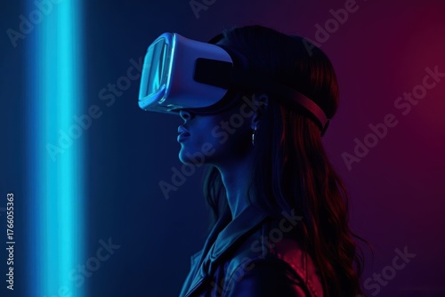 Side shot of young woman with virtual reality VR glasses in leather jacket against black background with red and blue neon lighting. Cyberpunk style