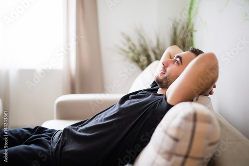 person, house, man, sun, sofa, couch, room, home, living, adult, casual attire, caucasian, clothing, domestic, lifestyle, lying, male, smiling, sitting, abode, apartment, attractive, calm, cheerful, clothes, content, denim, domicile, photogenic, happy, homelike, household, leisure, life, mature, peaceful, relaxed, relaxing, relax, back, people, lay, cosy, young, single, sunlight, window, 1, 20s
