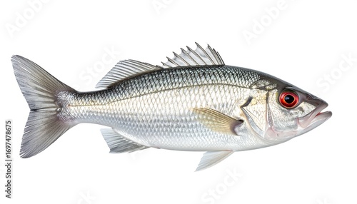 fish, seafood, marin, aquatic, vertebrate, animal, ocean, sea, nature, wildlife, scale, fin, tail, body, profile, portrait, fresh, raw, whole, isolated, white, background, closeup, detail, pale, grey, silver, red, eye
