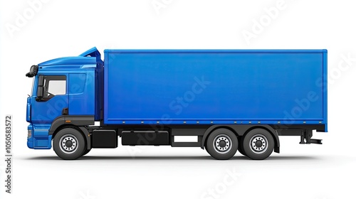 Side view of a large blue cargo truck with streamlined edges, set against a white background, perfect for showcasing transport services and delivery logistics.