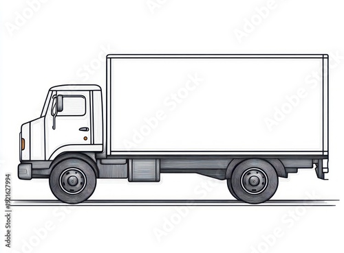 truck, delivery truck, vehicle, transport, logistic, commercial vehicle, half face, cab, wheel, road, minimalist, clean, illustration, line art, isolated, profile, freight, practical, accurateness
