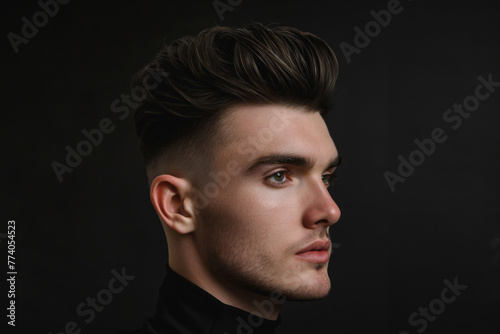 Side view of a young man showcasing a modern quiff hairstyle against a black background