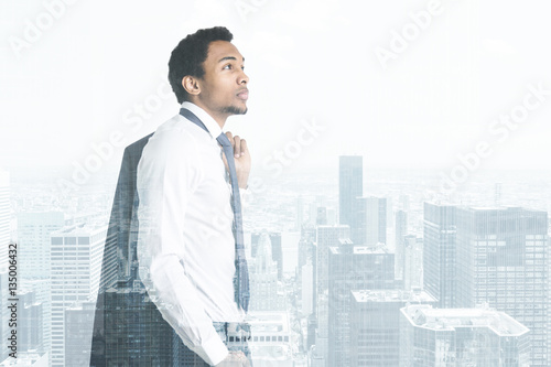 african, american, city, businessman, business, view, young, success, concept, man, people, successful, modern, building, office, suit, manager, looking, global, person, caucasian, white, professional, close, up, closeup, blank, empty, mock, copy, space, clear, nobody, attaching, hold, exposure, double, creative, skyscraper, formal, wear, clothes, arm, crossed, urban, standing, thinking