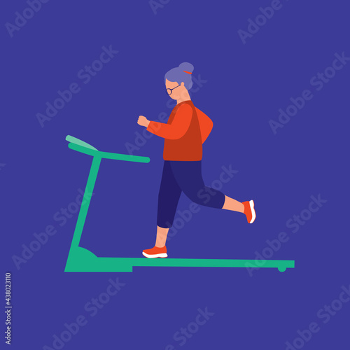 senior, elderly, treadmill, exercising, physical exercise, running, fitness, woman, old, jogging, active, lifestyle, healthy, leisure, well-being, wellness, vitality, machine, female, adult, 1, person, people, vector, illustration, cartoon, character, isolated