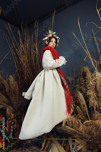 woman, fur coat, red scarf, pattern, carpet, rug, headdress, ancient, beauty, eco, harvesting, adorable, looking away, cute, beautiful, virgin, standing, studio, cheerful, hayloft, traditional, nature, female, ethnic, young, folk, culture, seriously, model, national, fashion, white, person, chaplet, lifestyle, elegant, attractive, accessory, reed, dressing, cotton, cane, lovely, posing