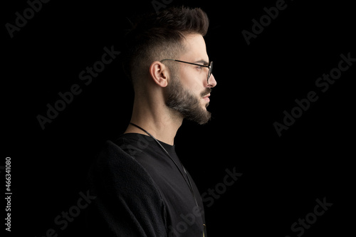 side, half face, confident, sensual, seductive, charming, alluring, eyeglass, goggles, posing, portrait, man, guy, young, fashion, model, sexy, attractive, photogenic, black, background, casual attire, wearing, looking, bearded, unshaved, holding, hand, dark, mysterious, dramatic, standing, studio