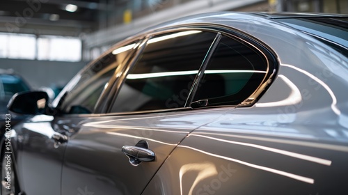 Side view of car window tint, ceramic film provides heat rejection and UV protection with stable color, car film installed on the glass surface of the , selected focus car tinting service