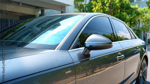 Side view of car window tint, ceramic film provides heat rejection and UV protection with stable color, car film installed on the glass surface of the , selected focus car tinting service