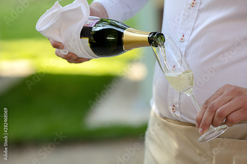 waiter, champaign, pour, glasses, alcohol, drink, bottle, party, celebration, beverage, festive, drinking, success, sparkling, crystal, fizzy, bubbly, wine glass, liquid, luxury, anniversary, alcoholic, serving, event, adult, catering, banquet, epicure, cutlery, elegant, enjoyment, staff, horizontal, half face, crop, body part, unrecognizable, anonymous, outdoors