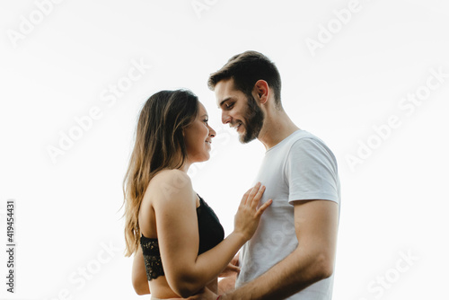 Side view of happy romantic young couple gently looking at each other while enjoying time together on rocky coast near sea on Tenerife island
