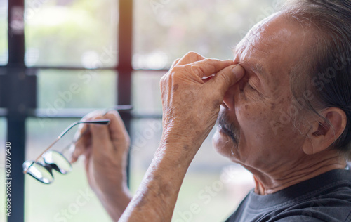Side view of mature old Asian man rubbing and wiping eyes and takes off glasses, feels eyes pain, suffering.