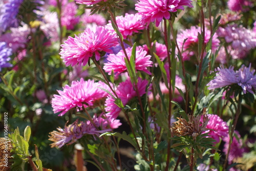 china, aster, pink, flower, nature, green, foliage, greenery, vegetation, flora, outdoors, plant, lush, beautiful, bright, vibrant, botany, ornamental, leaf, bud, inflorescence, bloom, blossom, head, ray, disc, floret, stem, herbaceous, annual, season, summer, fall, autumn, park, garden, flowerbed, bracts, cultivar