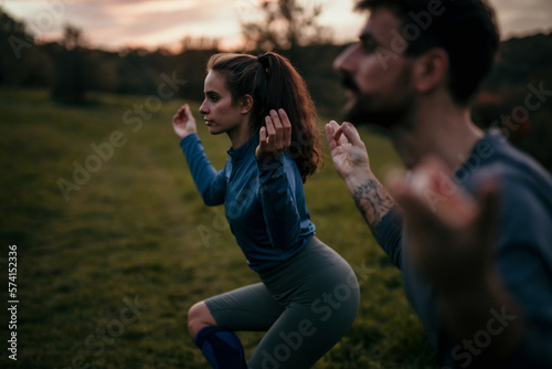 Side view of two focused people doing yoga and meditation after an outdoor workout.