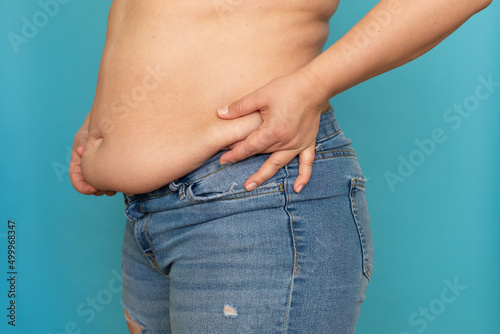 Side view of unrecognizable fat plump obese plus-size overweight woman stand in blue jeans, showing squeezing excess naked waist on blue background. Body positive, obesity, weight loss, liposuction.