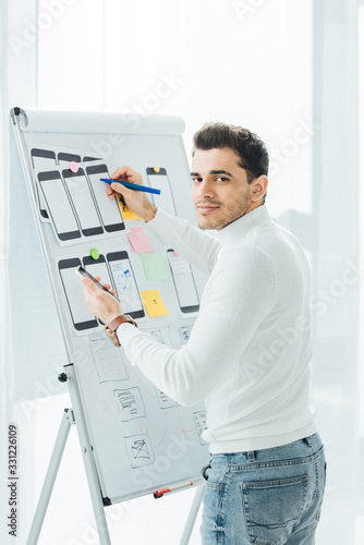 Side view of ux designer looking at camera while holding smartphone near mobile frameworks on whiteboard