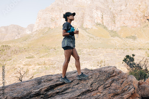 Side view of young female hiker standing with bottle water. Woman taking break after hike on mountain path.