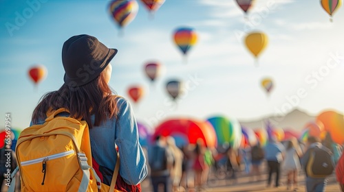 Side view of young female traveler standing with backpack watching colorful balloon festival