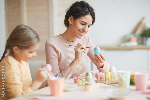 Side view portrait of happy young mother and daughter painting Easter eggs in cozy kitchen interior, copy space
