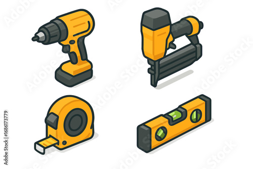 tool, construction, icon, set, isometric, vector, siding, renovation, repair, building, bricolage, home, improvement, drill, nailer, tape, measure, level, equipment, illustration, cartoon, work, house, contractor, handyman, builder, power, installation, industry, collection, yellow, professional, symbol, design, graphic, object, instrument, signs, carpenter's shop, maintenance, craft, kit, service, build, workshop