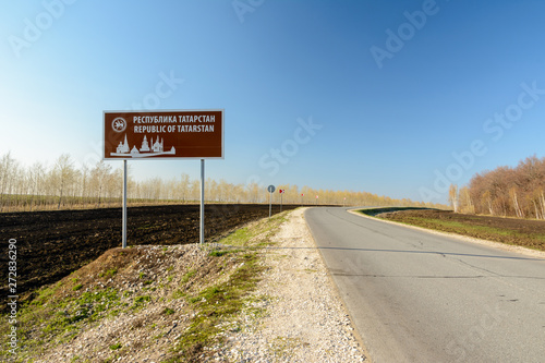 Sign welcome to Tatarstan. Tatarstan signpost on a rural road. Tatarstan road sign against clear blue sky. Asphalt road close-up.