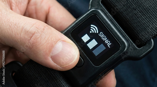 Signal indicator wearable device black strap close up finger pressing button digital display technology communication connectivity hand